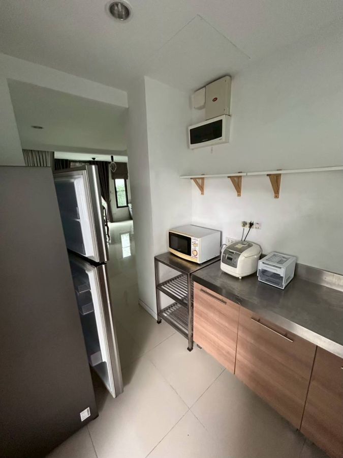 โซนครัว & ซักล้าง: เคาน์เตอร์ท็อปสแตนเลส, เตาแก๊ส 2 หัว, ไมโครเวฟ, ตู้เย็น Samsung 12 คิว, หม้อหุงข้าว, เครื่องซักผ้าฝาหน้า Electrolux 9 kg. พร้อมปั๊มน้ำและถังสำรอง