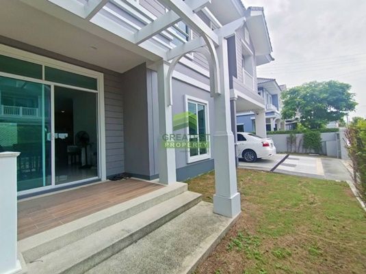 ตกแต่ง : บ้านเดี่ยว 2 ชั้น แปลงมุม บ้านสวยหรู สไตล์นิวอิงแลนด์โคโลเนียล พื้นที่ใช้สอย 262 ตร.ม ชั้นล่างพื้นกระเบื้องแกรนิตโต้ สีครีมสวย 1 ห้องรับแขก, 1 ห้องนอน, 1 ห้องครัว, พร้อมส่วนเตรียมอาหาร และ ห้องแม่บ้าน เฉลียงหน้าบ้านกว้าง สามารถ ชั้นบนพื้นลามิเนตสีเนื้อไม้ บันไดราวเหล็กหุ้มเนื้อไม้จริง พื้นไม้จริง สวย แข็งแรง มี 3 ห้องนอน พร้อมห้องน้ำในตัวทุกห้อง พร้อมตู้อาบน้ำ ห้องนอนใหญ่มีระเบียงกว้าง สามารถนั่งรับลม ชมวิวธรรมชาติได้ โถงบันไดกว้างสามารถปรับเป็นพื้นที่เอนกประสงค์ได้ ด้านหน้า