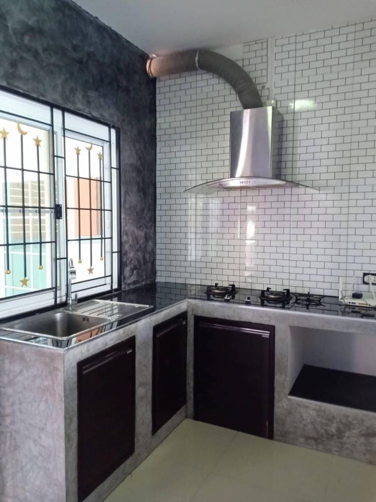 - ห้องครัวในบ้านมีเคาน์เตอร์ปูน พร้อมเตาแก๊ซและเครื่องดูดควัน