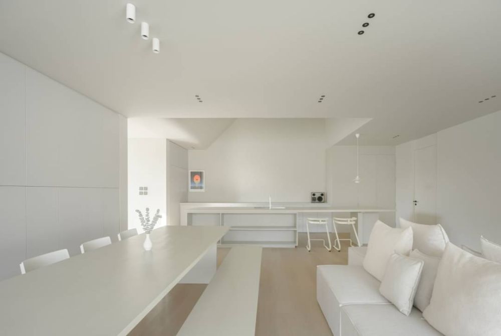 ชั้นล่าง เป็นพื้นที่ส่วนรับแขก กว้างขวาง เพดานสูงประมาณ 7 เมตร ตกแต่งด้วยบิ้วอิน กระจกด้านข้างติดสวนหลังบ้าน เฟอร์นิเจอร์น้อยชิ้น แต่เรียบหรูดูแพง ห้องทำงานโปร่งด้วยกระจกมองเห็นวิวทุ่งนา