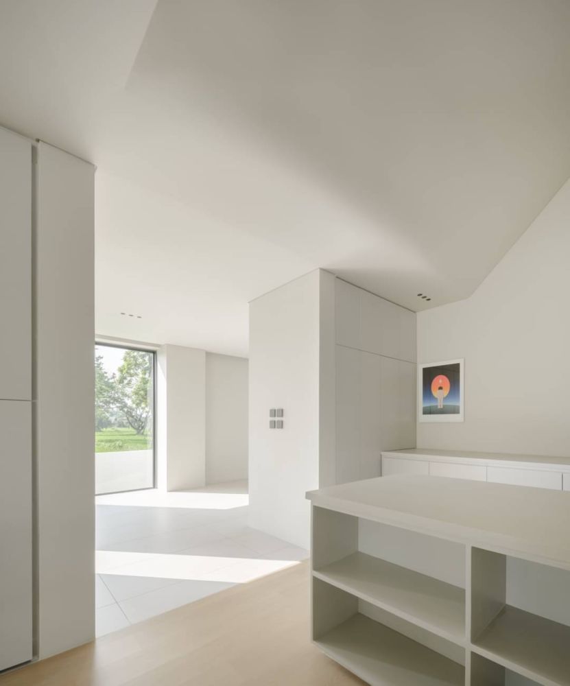 The first floor is a spacious living area with a ceiling height of approximately 7 meters, decorated with built-ins. The side mirror is attached to the back garden. Few pieces of furniture But it's elegant and expensive. The work room is airy with glass overlooking the rice fields.