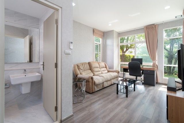 -ชั้นล่าง เป็นโซนห้องรับแขก และดูทีวี มีโซนรับประทานอาหาร และ 1 ห้องครัวฝรั่งพร้อมเคาน์เตอร์ Built-in และยังมี 1 ห้องเอนกประสงค์ สามารถใช้เป็นห้องนอน หรือห้องทำงานได้