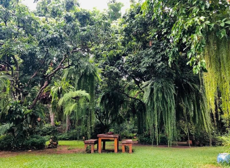โดยรอบตัวบ้านเป็นพื้นที่สวนและสนามหญ้า มีต้นไม้ใหญ่เยอะ เช่น และพรรณไม้หลากหลายชนิด บรรยากาศเย็น เป็นธรรมชาติ ร่มรื่น เหมือนป่าในเมือง