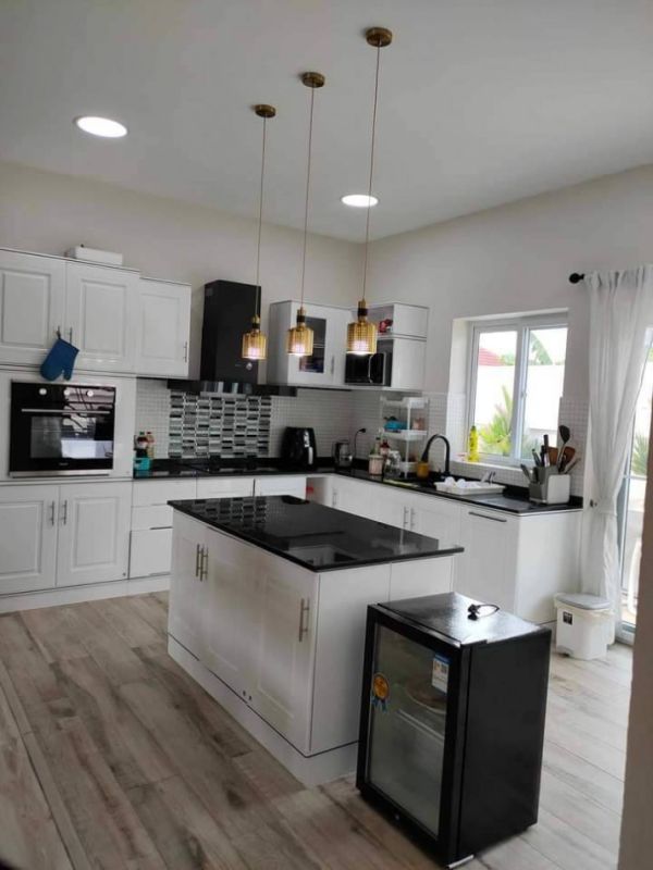 - ห้องครัว Built-in ยุโรปด้านใน พร้อมเตาไฟฟ้า ฮูด ไมโครเวฟ และครัวไทยด้านนอก