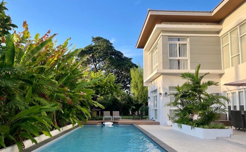 สนามหญ้าข้างบ้าน พร้อมสระว่ายน้ำส่วนตัว