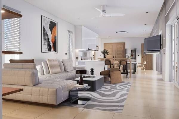 สัมผัสความหรูหรากับพูลวิลล่าชั้นเดียว ที่ออกแบบภายใต้แนวคิด Open Living Space เชื่อมต่อห้องนั่งเล่น พื้นที่รับประทานอาหาร และครัวในสไตล์ LDK ให้ความโปร่งโล่ง พร้อมเชื่อมทุกมุมของบ้านอย่างลงตัว