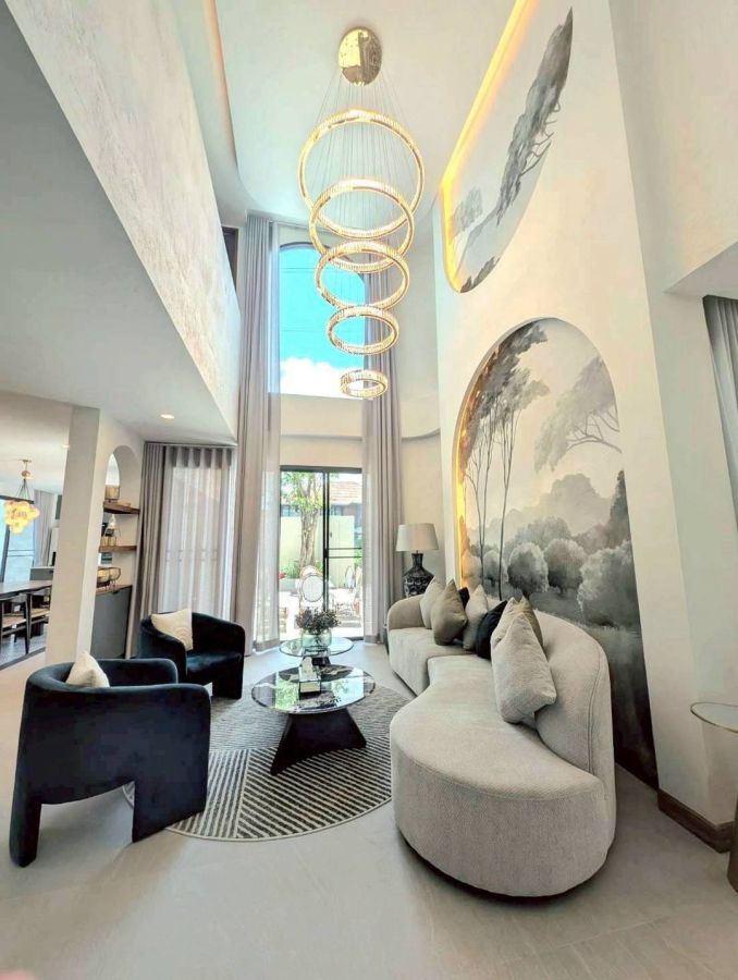 -ห้องรับแขกเพดานสูง พร้อมชุดโซฟาและทีวีตกแต่งสไตล์ลักชัวรี