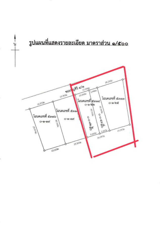 - ที่ดินขนาด 485 ตารางวา (64 x 30 เมตร) รูปสี่เหลี่ยมผืนผ้า หันหน้าทิศเหนือ
