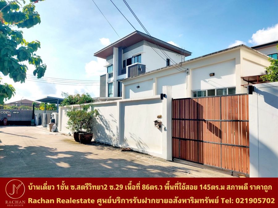 ขายด่วน บ้านเดี่ยวชั้นเดียว สตรีวิทยา 2 ซอย 29 แยก 6 เนื้อที่ 86 ตารางวา พื้นที่ใช้สอย 104 ตารางเมตร 2ห้องนอน 2ห้องน้ำ 1ห้องครัว 1ห้องนั่งเล่น/รับแขก 3ที่จอดรถ หน้าบ้านหันทิศเหนือ อายุตัวบ้าน 15ปี สภาพดีไม่โทรม ต่อเติมหลังคาจอดรถและหลังคาส่วนซักล้าง ราคาถูกมาก ยินดีจัดสินเชื่อให้ฟรี