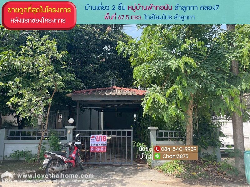 ขายบ้านเดี่ยว 2 ชั้น หมู่บ้านฟ้าทอฝัน ลำลูกกา คลอง7 พื้นที่ 67.5 ตรว. ขายถูกที่สุดในหมู่บ้าน หลังแรกของโครงการ ใกล้โฮมโปร ลำลูกกา