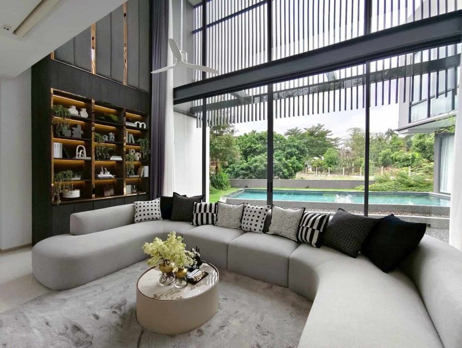 • 挑高双层客厅(Double Volume),采光极佳,与泳池景观自然连通,配有大面积落地滑门,引入自然光与清新空气,营造宁静舒适、绿意环绕的居住氛围。