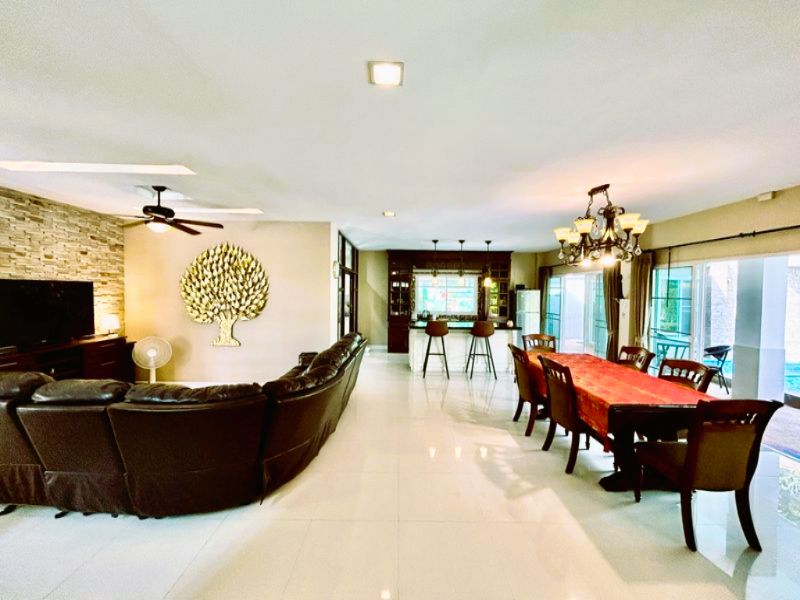 - ห้องนั่งเล่นและห้องรับประทานอาหารแบบเปิดโล่ง พร้อมบาร์ เชื่อมต่อกับระเบียงสระว่ายน้ำ