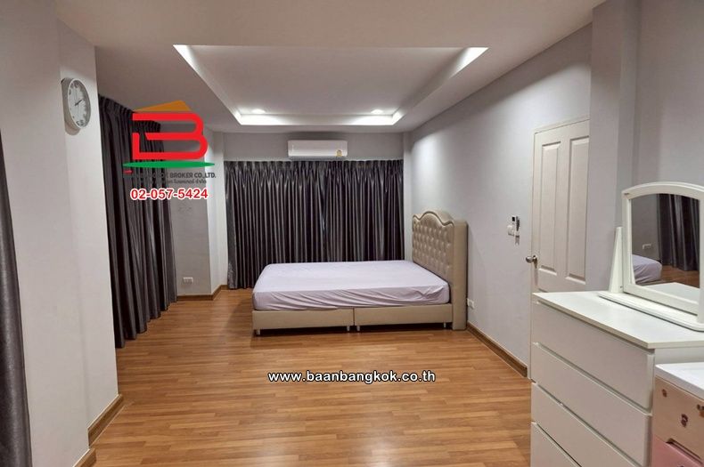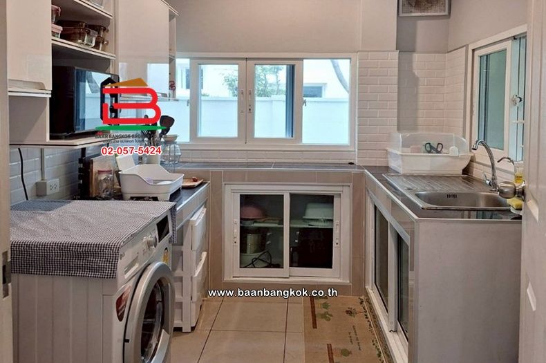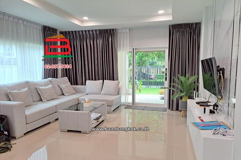 การตกแต่ง : บ้านต้นโครงการ หน้าบ้านหันทางทิศเหนือ ประตูรั้วรีโมท ประตูบ้านดิจิตอลดอร์ล็อค พื้นบ้านชั้นล่างปูด้วยกระเบื้องแกรนิตโต้ พื้นบ้านชั้นบนปูด้วยลามิเนต ขายพร้อมเฟอร์นิเจอร์บางส่วน ต่อเติมห้องเก็บของชั้นบน ติดผ้าม่าน พร้อมแอร์ 4 เครื่อง ห้องน้ำ มีเครื่องทำน้ำอุ่น 3 เครื่อง ตกแต่งห้องครัวบิวท์อิน พร้อมติดกล้องวงจรปิด และมีพื้นที่สีเขียวกว้างรอบๆบ้าน ทำเลโครงการติดถนนใหญ่ ถนนสุขาภิบาล 5 การเข้า-ออกโครงการด้วยระบบรีโมตคอนโทรล และระบบ CCTV ณ จุดเข้า-ออก ล้อมรั้วรอบโครงการสูง 3 เมตร ถนนโครงการกว้าง 10 เมตร รปภ.ตลอด 24 ชั่วโมง และมีสวนพักผ่อนขนาดใหญ่ คลับเฮาส์ใหญ่ดีไซน์เรียบหรูและร่วมสมัย