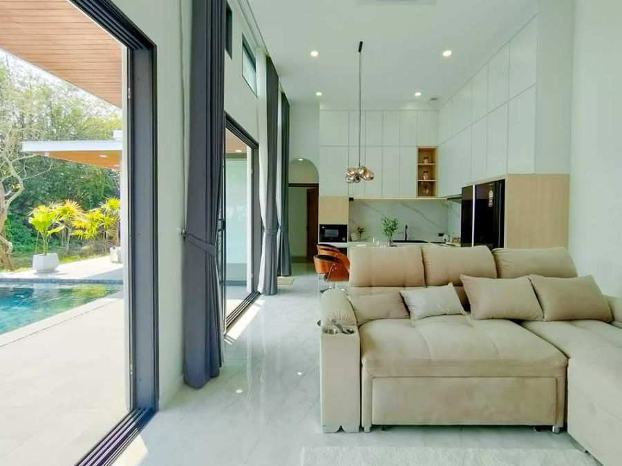พื้นที่นั่งเล่น: ห้องนั่งเล่นกว้างขวางพร้อมหน้าต่างบานใหญ่ รับแสงธรรมชาติได้เต็มที่ พร้อมวิวสระว่ายน้ำและพื้นที่สีเขียว