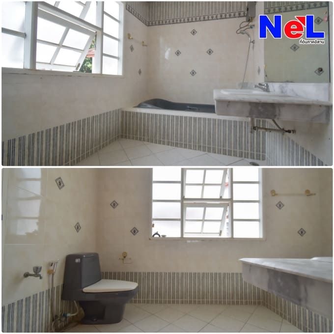 - 1 ห้องน้ำใหญ่พิเศษ มีหน้าต่างสไตล์ยุโรป มีอ่างอาบน้ำและสุขภัณฑ์ที่ถูกตกแต่งด้วยโทนสีขาว-เทาสะอาดตา