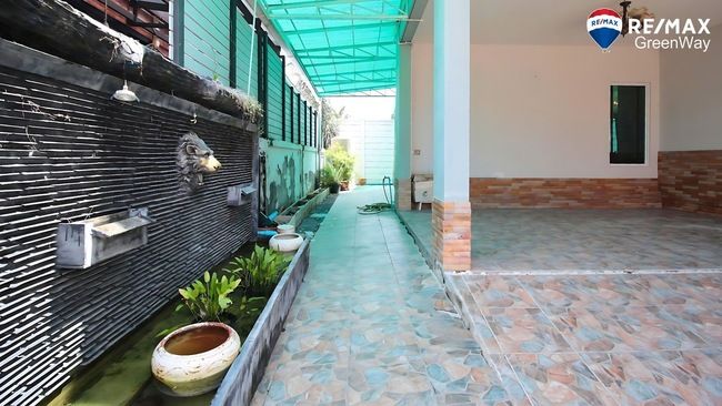 พื้นรอบบ้านดูแลง่าย : ไม่รก เดินได้สะดวก มี 2 ส่วน คือ พื้นดินไว้ปลูกต้นไม้ยืนต้น หรือต้นไม้กระถางก็เก๋ และ เทปูน ปูกระเบื้อง ที่ลานจอดรถหน้าบ้าน ด้านข้าง (บางส่วน) และด้านหลัง ด้านข้างบ้านทำบ่อเลี้ยงปลาขนาดกลางไว้เสริมฮวงจุ้ยบ้าน และให้ความผ่อนคลายกับเจ้าของบ้านได้ทุกเมื่อ