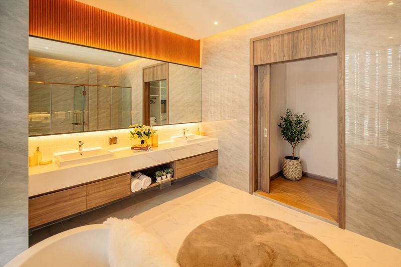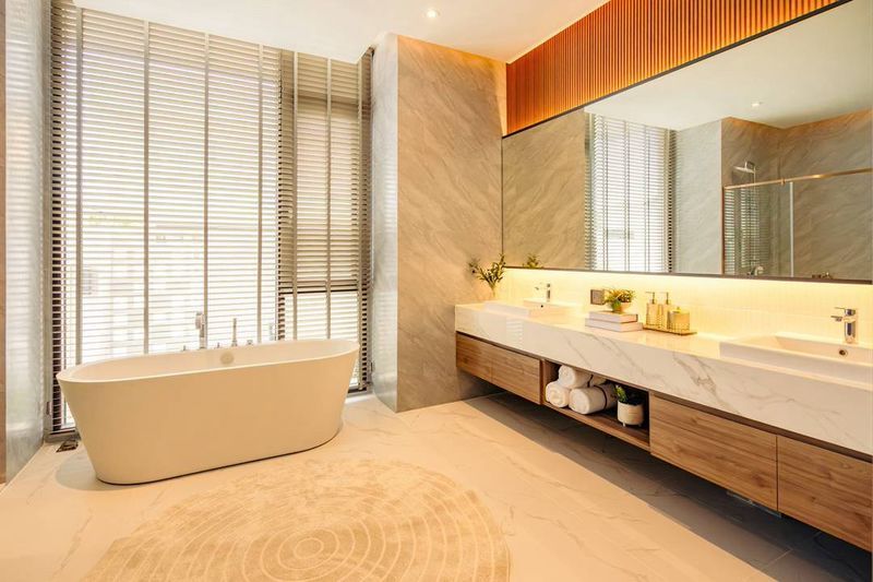 - ห้องน้ำ Master ขนาดใหญ่ พร้อมอ่างอาบน้ำและวัสดุตกแต่งพรีเมียม