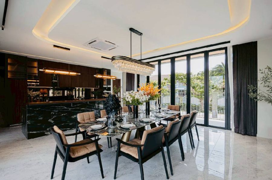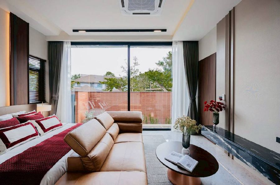 ดีไซน์ Modern Luxury ผสานวัสดุพรีเมียม — เหล็ก ไม้ กระจก และหินลายเฉพาะ สะท้อนรสนิยมและความอบอุ่นอย่างลงตัว