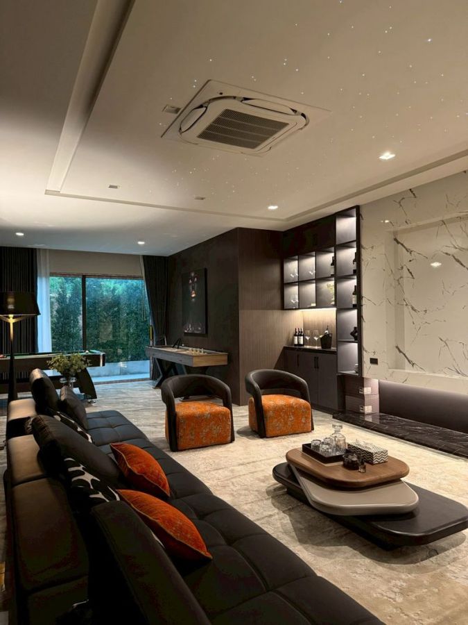 ห้องปาร์ตี้ขนาดใหญ่ พร้อมบาร์ โต๊ะพูล เครื่องเล่นกอล์ฟซิมูเลเตอร์ และเกม Shuffleboard