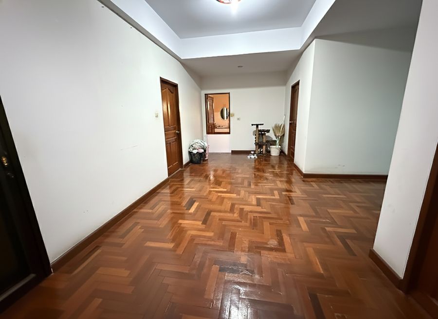 พื้นที่ใช้สอยภายในเน้นความมั่นคงและแข็งแรง ด้วยพื้นไม้ปาร์เก้ลายก้างปลาสีเข้มสุดคลาสสิกที่ให้ความรู้สึกอบอุ่นในทุกห้องนอน ขณะที่พื้นที่ส่วนกลางต้อนรับด้วยแสงแดดอ่อนๆ ยามเช้าที่ส่องผ่านหน้าต่างบานใหญ่ ทำให้ห้องนั่งเล่นทั้งสองห้องดูโปร่งสบาย เหมาะสำหรับการรวมญาติและพักผ่อนในครอบครัว