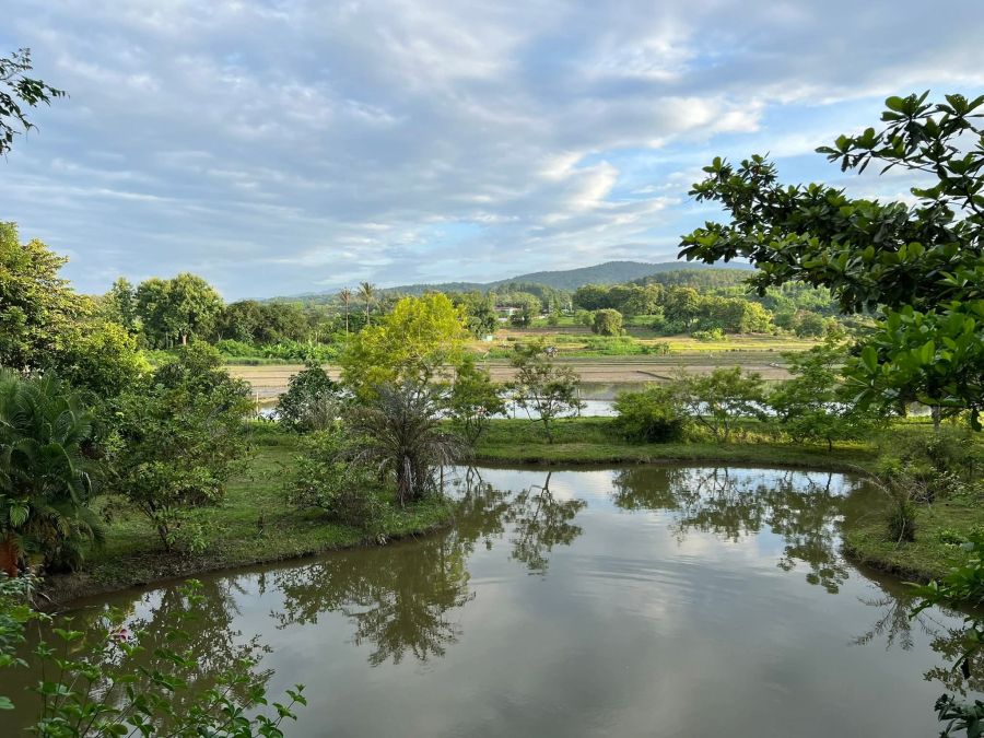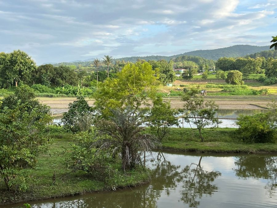 มีลำน้ำแม่ริมโอบล้อมทางทิศตะวันออกและทิศใต้ + น้ำชลประทาน + น้ำประปา + น้ำบาดาล + น้ำในสระเลี้ยงปลาติดทุ่งนา เห็นวิวเทือกเขาหลายชั้น