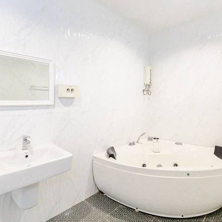 ห้องน้ำ มีอ่างอาบน้ำและอ่างจากุซซี่ พร้อมเฟอร์นิเจอร์