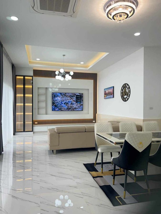 Detached house in a great location with a private pool. Luxurious European-style decor. Fully built-in, complete with all new furnitures and appliances. Ready to move in! Brand new house with standard construction and 24 piles.