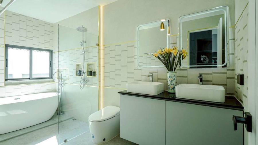 ปูกระเบื้องสีขาวสะอาด เพิ่มมิติความโดดเด่นให้ตัวบ้าน