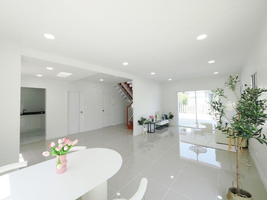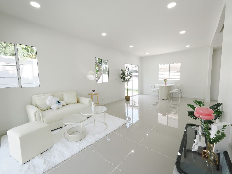 - ภายในบ้านปูพื้นด้วยแกรนิตโต้อย่างดี บันไดไม้เนื้อแข็ง ชั้นบนปูพื้นลามิเนท ประตู-หน้าต่าง อลูมิเนียมบานเลื่อน ทาสีตกแต่งใหม่ทั้งหลัง พร้อมเฟอร์นิเจอร์ โซฟา โต๊ะ เก้าอี้ พรม ห้องน้ำสไตล์โมเดิล แยกส่วนเปียก-แห้ง ระบบไฟLed ห้องครัวพร้อมเคาน์เตอร์ เครื่องดูดควัน ซิงค์ล้างจานครบ ห้องMasterขนาดใหญ่ พร้อมระเบียง จอดรถในบ้านได้ 2 คัน