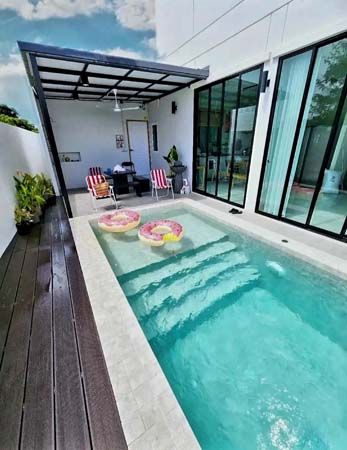 เป็นพูลวิลล่า 2 ชั้น หลังมุม มี 4 ห้องนอน 4 ห้องน้ำ