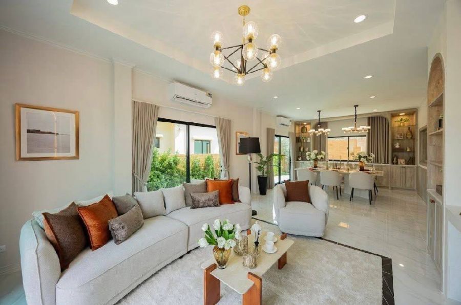 • ห้องรับแขก + ห้องทานอาหาร (โต๊ะหินอ่อน + เก้าอี้ 6 ที่นั่ง)