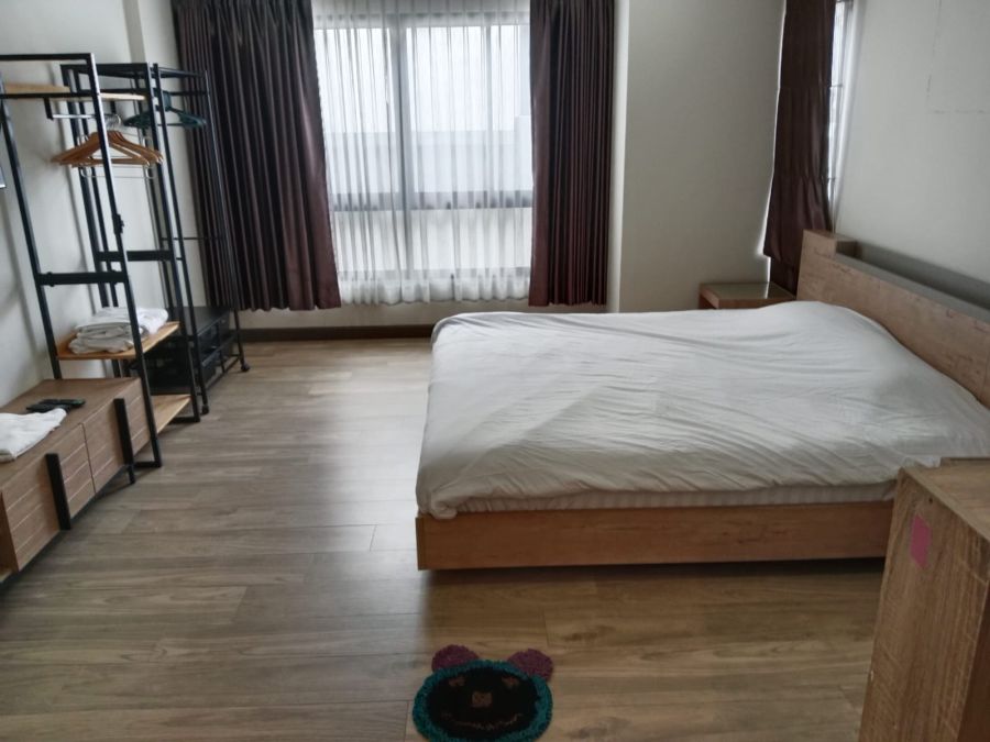 มีโต๊ะรับประทานอาหาร อุปกรณ์จาน ถ้วย ชาม ช้อนซ่อม หม้อหุงข้าว กะทะไฟฟ้า กาต้มน้ำร้อน เครื่องทำน้ำอุ่น โซฟารับแขกที่ห้องนั่งเล่น