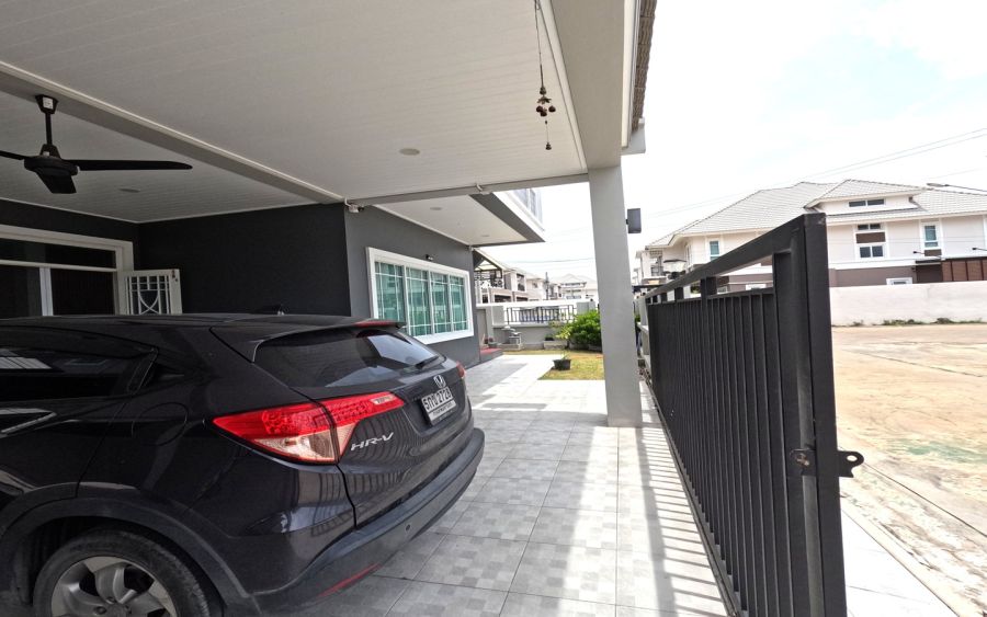 The roof of the carport has been extended. There is a side house. The entrance to the house is a carved door. There are 2 entrances. The side is a glass sliding door with pleated mosquito nets.