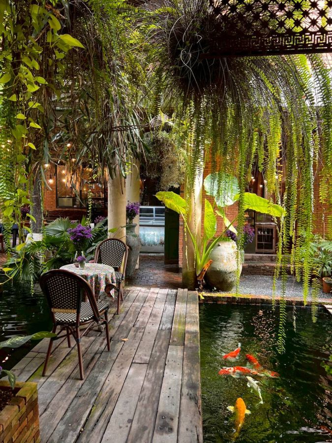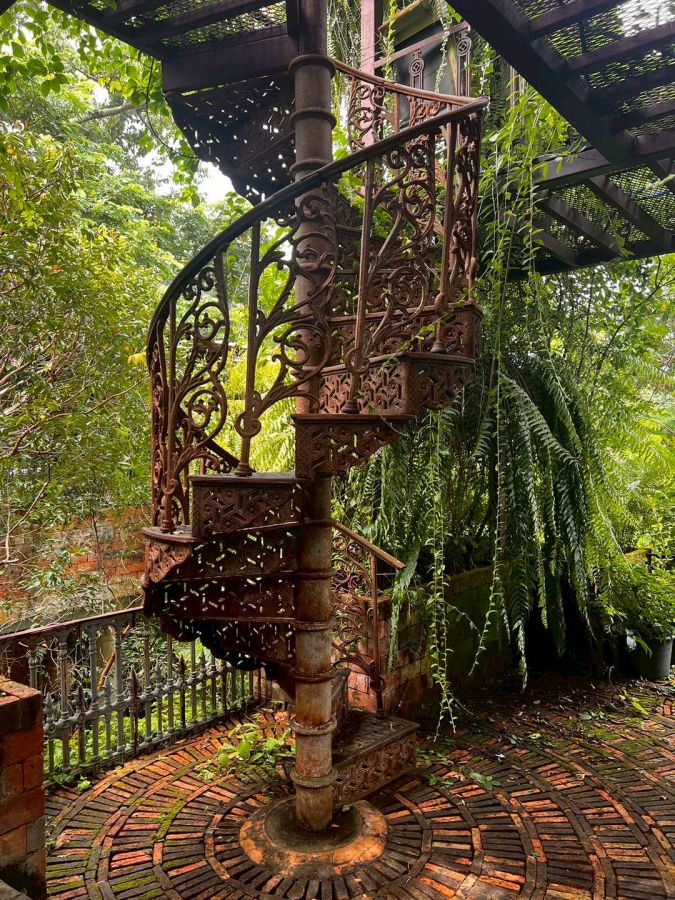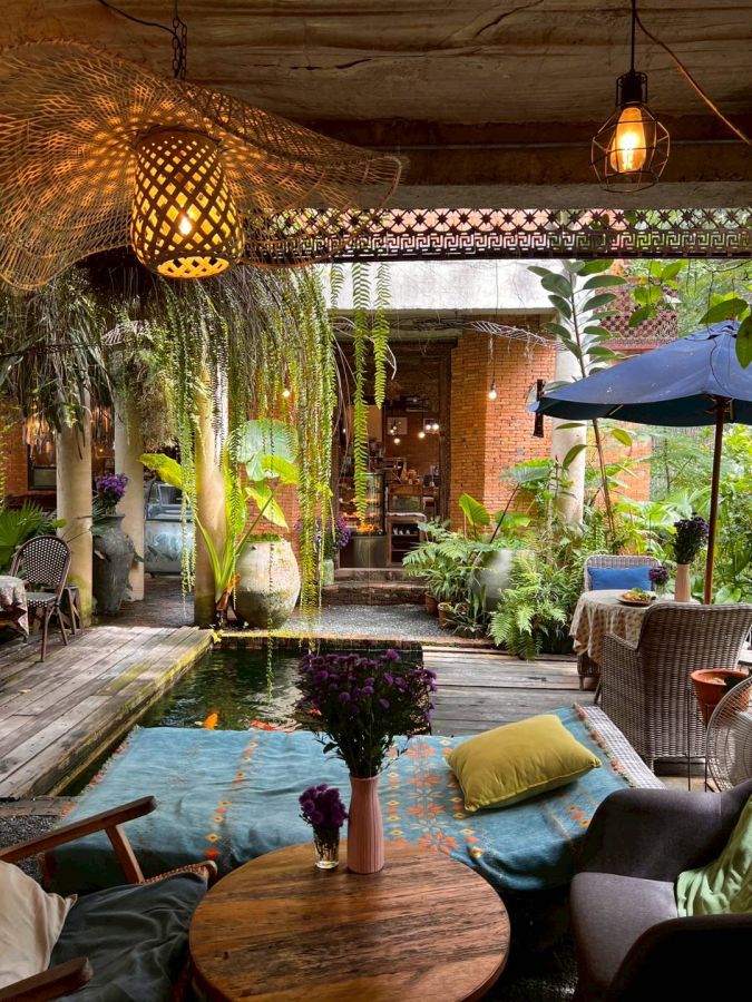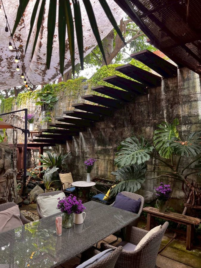 An antique Indian wooden door, over 300 years old, a spiral staircase, an antique cast iron Indian staircase, and numerous antique collectibles. The garden features a forest with rubber trees, baobab trees, rain trees, and numerous other large trees, covering the entire area. The quiet, peaceful Green and Nature Home Cafe concept features a pond, koi pond, and the soothing sound of a waterfall. Relax and recharge, completely free from the hustle and bustle of the outside world.