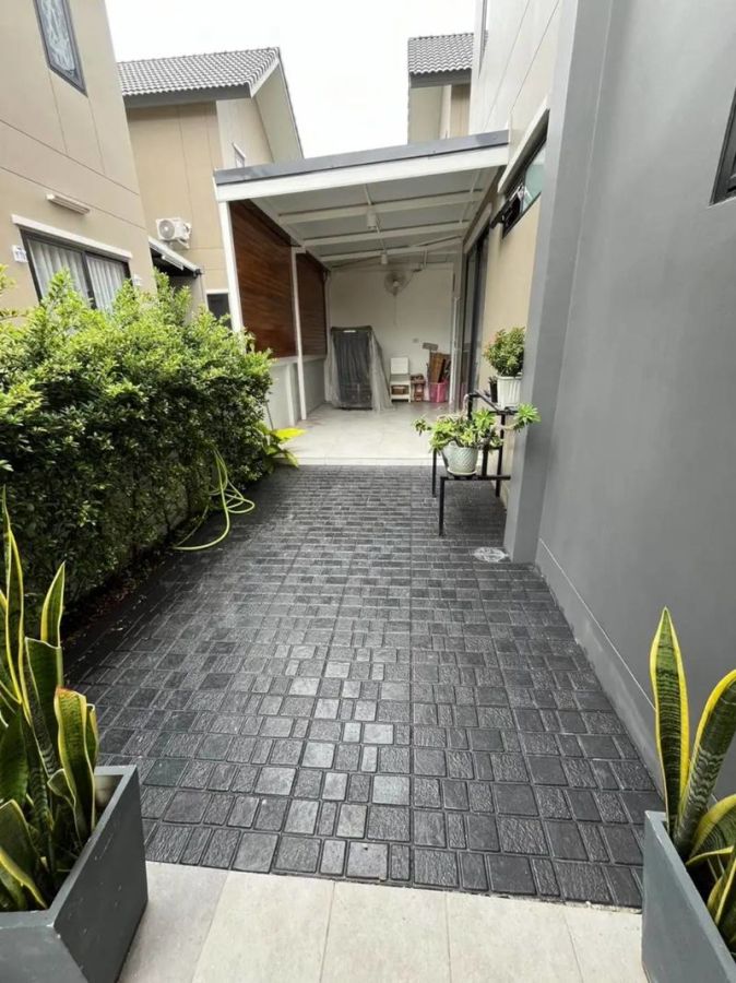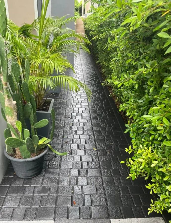 รอบบ้านปลูกต้นไม้ ปูพื้นด้วยกระเบื้องคอนกรีตรอบบ้าน