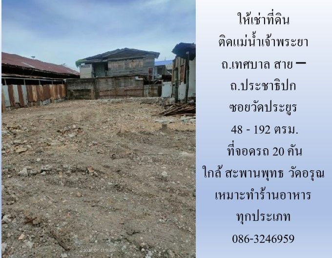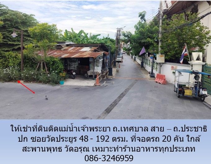ให้เช่าที่ดินติดแม่น้ำเจ้าพระยา ถ.เทศบาล สาย – ถ.ประชาธิปก ซอยวัดประยูร 48 - 192 ตรม. ที่จอดรถ 20 คัน ใกล้ สะพานพุทธ วัดอรุณ เหมาะทำร้านอาหารทุกประเภท
