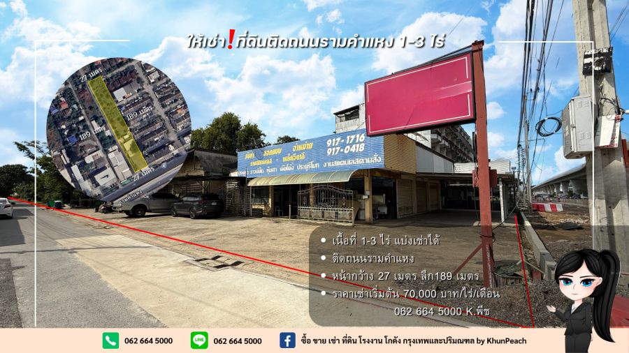 ให้เช่า‼️ที่ดินติดถนนรามคำแหง 1-3 ไร่ 💥 รามคำแหง มีนบุรี ราษฎร์พัฒนา📍 เหมาะทำร้านค้าปลีก-ส่ง วัสดุก่อสร้าง เมทัลชีท ธุรกิจทุกประเภท ฯลฯ