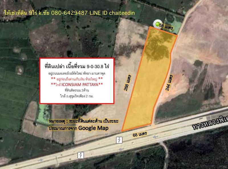 ให้เช่าที่ดิน 9ไร่ ติดถนนมอเตอร์เวย์ พัทยา ห้วยใหญ่ บางละมุง ชลบุรี หน้ากว้าง 68เมตร ลึก 250เมตร ถมแล้ว ห่างจากถนนสุขุมวิท 2กม.เข้า-ออกได้หลายทางเหมาะพัฒนาอสังหาริมทรัพย์ โซนที่พักอาศัย ค่าเช่า 20,000/ไร่/เดือน ให้เช่าระยะยาวได้ สนใจที่ดินสอบถามรายละเอียด ติดต่อคุณชัย 080-6429487 LINE ID chaiteedin
