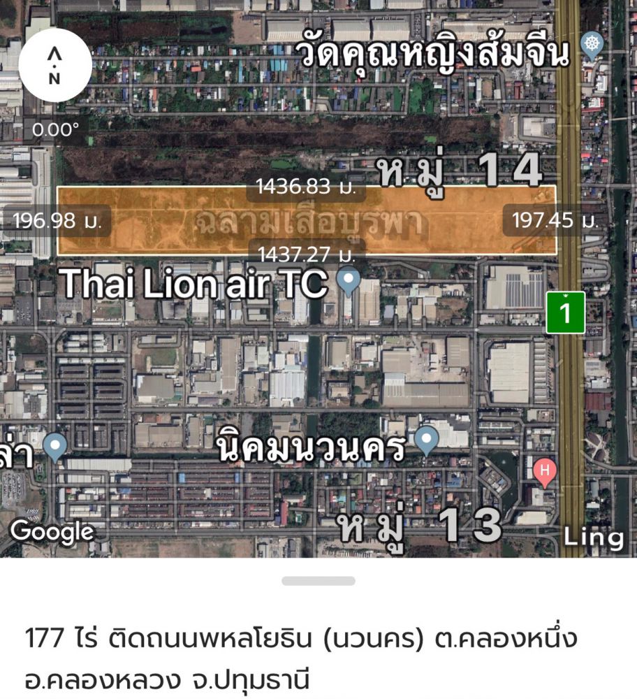 ขายที่ดิน 177 ไร่ ตั้งอยู่ติดถนนพหลโยธินฝั่งขาออก ต.คลองหนึ่ง อ.คลองหลวง จ.ปทุมธานี หน้ากว้างติดถนนพหลโยธินยาวประมาณ 200 เมตร เป็นถนนหลักสายสำคัญมากอีกเส้นหนึ่งสำหรับการเดินทางสู่สายเหนือและอิสาน ด้านข้างที่ดินลึกยาวประมาณ 1,400 เมตร ที่ดินแปลงติดกันกับแปลงนี้ ด้านซ้ายติดกับห้าง Big C นวนคร ด้านขวาติดกับแขวงทางหลวงปทุมธานี ผังเมืองที่ดินสีน้ำตาล อยู่ในเขตพื้นที่ที่มีผู้คนผ่านไป-มาหนาแน่นมาก เป็นที่ดินที่มีศักยภาพทางธุรกิจสูงมาก เหมาะสมแก่การลงทุนอย่างยิ่ง (แปลงใหญ่ในย่านนี้เหลืออยู่ไม่กี่แปลงแล้ว)