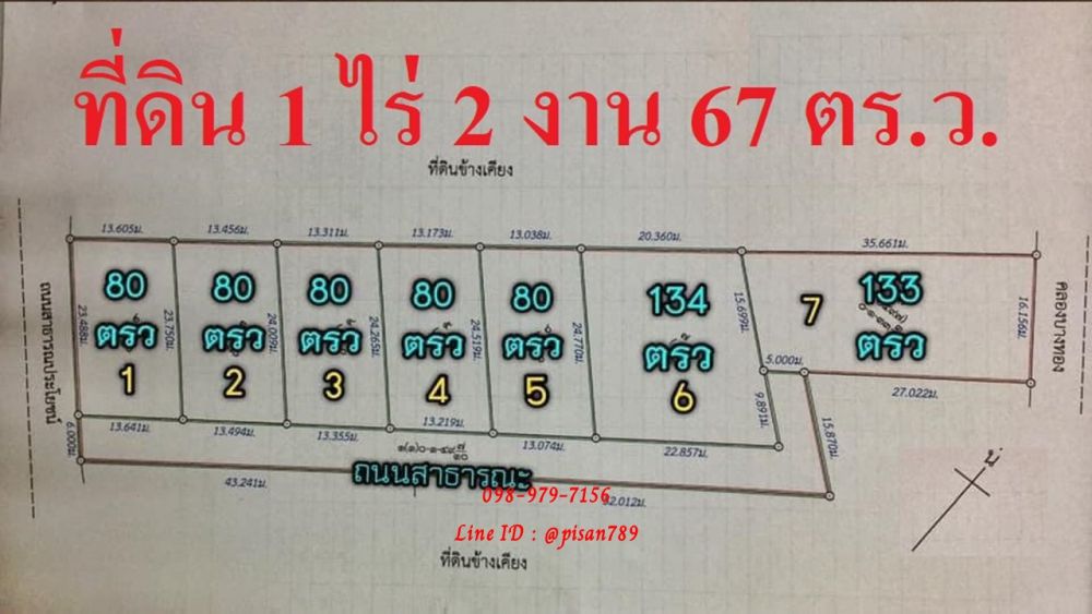 #ที่ดินแบ่งขาย 80 ตารางวา หน้ากว้าง 13.038 - 35.661 เมตร ลึก 23.75-24.77 เมตร