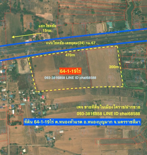 ขายที่ดินติดถนนโชคชัย-เดชอุดม (24)กม.67 เนื้อที่ 64-1-19ไร่ ตำบลหนองหัวแรต อำเภอหนองบุญมาก จังหวัดนครราชสีมา ที่ดินหน้ากว้าง 470เมตร ลึก 200เมตร ห่างจาก CPFโชคชัย ประมาณ 8.5กม.ราคาไร่ละ 1.6 ล้าน (ขายยกแปลง) สนใจที่ดินติดต่อเฮียชัย 📞093-3816858 LINE ID chai68588 #เพจ ขายที่ดินในเมืองโคราช/ฝากขาย 🌐https://web.facebook.com/chai68588