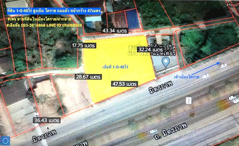 ขายที่ดินติดถนนมิตรภาพสูงเนิน นครราชสีมา เนื้อที่ 1 ไร่ 46ตรว.ถมแล้ว ใกล้โรงงานซีเกทสูงเนิน หน้ากว้าง 45เมตร เหมาะพัฒนา เป็นห้างร้าน สำนักงาน อื่นๆ ราคา 30,000/ตรว. สอบถามเพิ่มเติม ติดต่อเฮียชัย 📞093-3816858 LINE ID chai68588 🌐https://web.facebook.com/chai68588