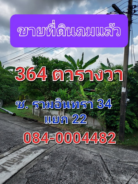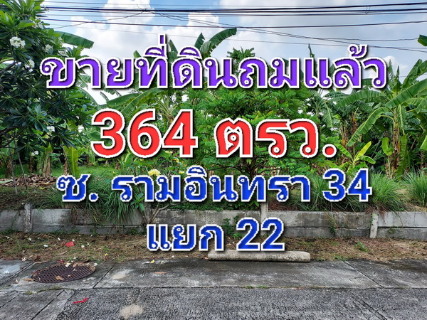 ขายที่ดินถมแล้ว เนื้อที่ 364 ตารางวา ซอยรามอินทรา 34 แยก 22 ซอยอยู่เย็น ใกล้ถนนเลียบทางด่วนเอกมัย-รามอินทรา