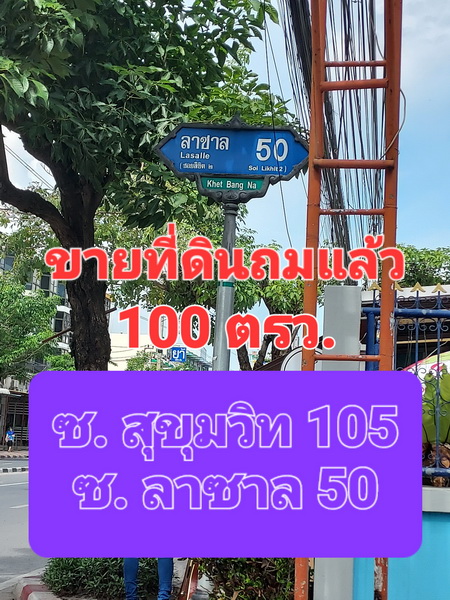 ขายที่ดินถมแล้ว เนื้อที่ 100 ตารางวา ซอยสุขุมวิท 105 ซอยลาซาล 50 เข้าซอยเพียง 300 เมตร