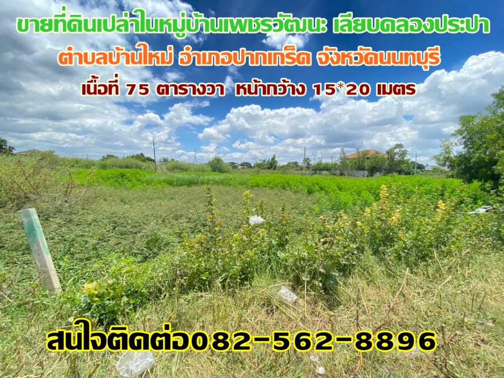 ขายที่ดินเปล่าในหมู่บ้านเพชรวัฒนะ เลียบคลองประปา ย่านปากเกร็ด ตำบลบ้านใหม่ อำเภอปากเกร็ด จังหวัดนนทบุรี ถนนแจ้งวัฒนะ