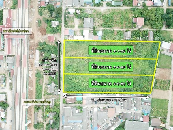 หน้ากว้างติดถนนประมาน แปลงละ 36 เมตร ลึกประมาน 175เมตร ขนาดที่ดิน แปลงละ 4 ไร่เศษ