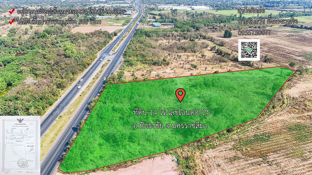 ทำเลที่ดินที่มีศักยภาพสำหรับการสร้างธุรกิจในจังหวัดโคราช ลักษณะที่ดินมีขนาดทั้งหมด 14 ไร่ติดถนนใหญ่หมายเลข 24 โชคชัย-เดชอุดม