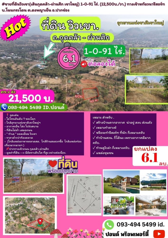 ที่ดินวิวเขาล้อมรอบ (เส้นกุดคล้า-ผ่านศึก เขาใหญ่) 1-0-91 ไร่. (12,500บ./วา.) หทัยวนารีสอร์ท บ.โนนกระโดน ต.ดงพญาเย็น อ.ปากช่อง L058