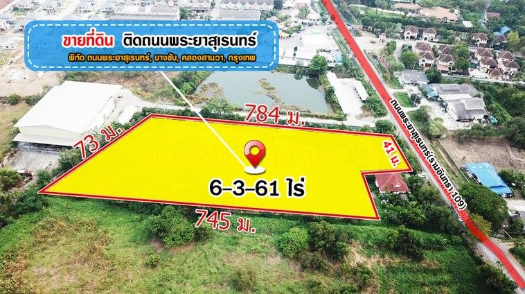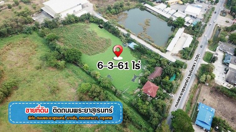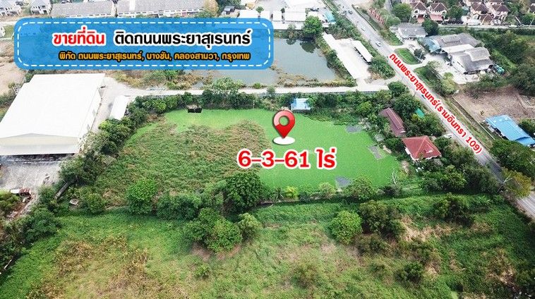 ที่ดินแปลงสวย ขนาด 6-3-61 ไร่ ติดถนนพระยาสุเรนทร์ ถนนรามอินทรา109 บางชัน คลองสามวา กรุงเทพ