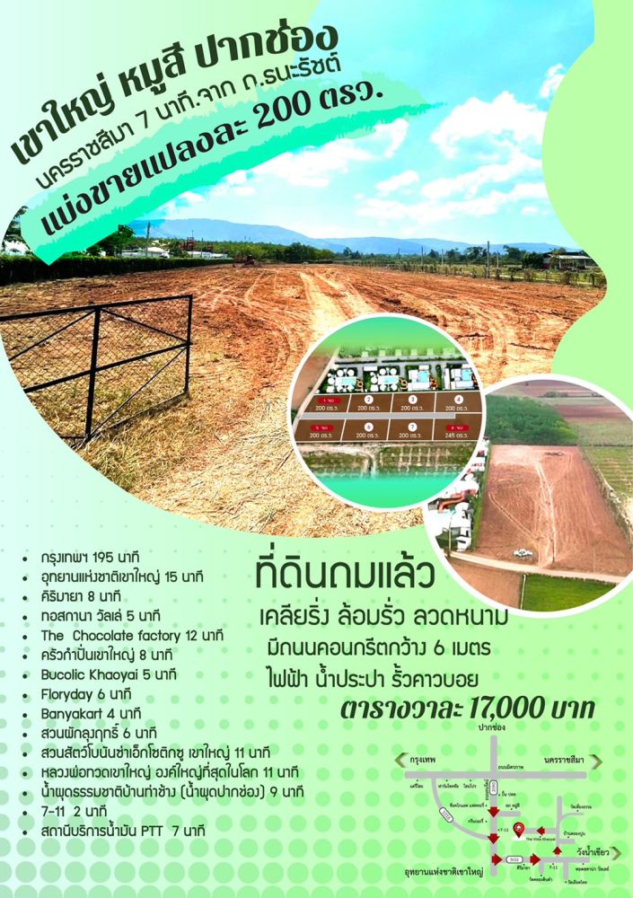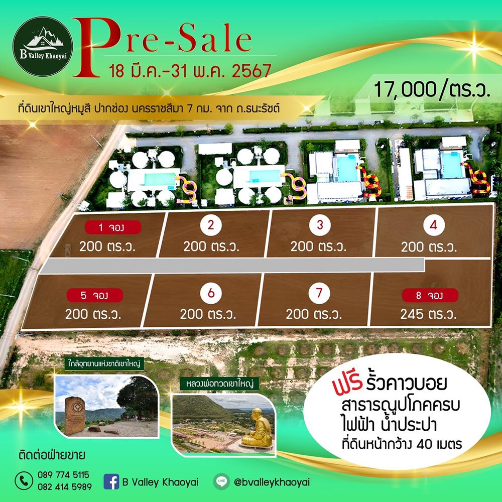 โครงการ บี วัลเลย์ เขาใหญ่ แบ่งขายที่ดินแปลงละ 200 ตรว. ที่ทองหล่อเขาใหญ่ หมู่สี เข้าจากถนนธนรัตน์เพียง 7 กม. ติดกับ เดอะวิสต้า เขาใหญ่ พูลวิลล่า ที่ดินทำเลดี วิวเขาใหญ่